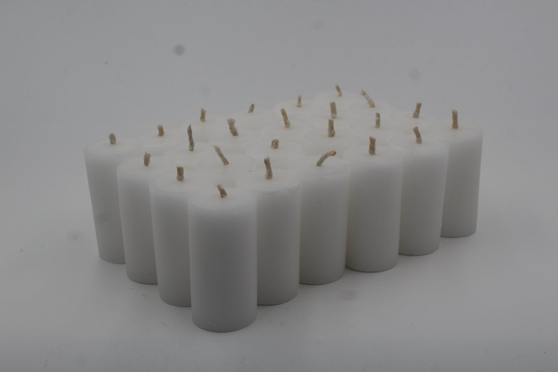24 Velas de alta calidad en forma de cirio (3x6 cm), elaboradas con parafina y malasia para una combustión uniforme y prolongada (aprox. 3-4 horas de duración). Ideales para decoración, eventos, ceremonias o ambientación.