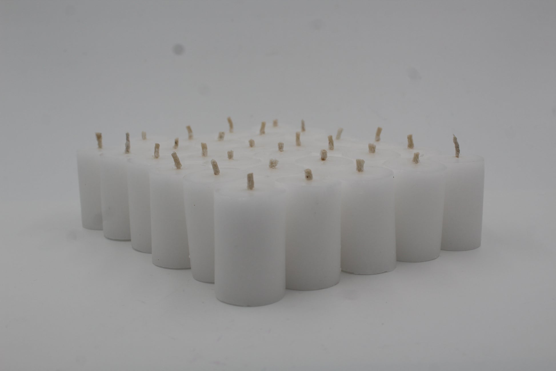 30 Velas de alta calidad en forma de cirio (3x4.5 cm), elaboradas con parafina y malasia para una combustión uniforme y prolongada (aprox. 3-4 horas de duración). Ideales para decoración, eventos, ceremonias o ambientación.