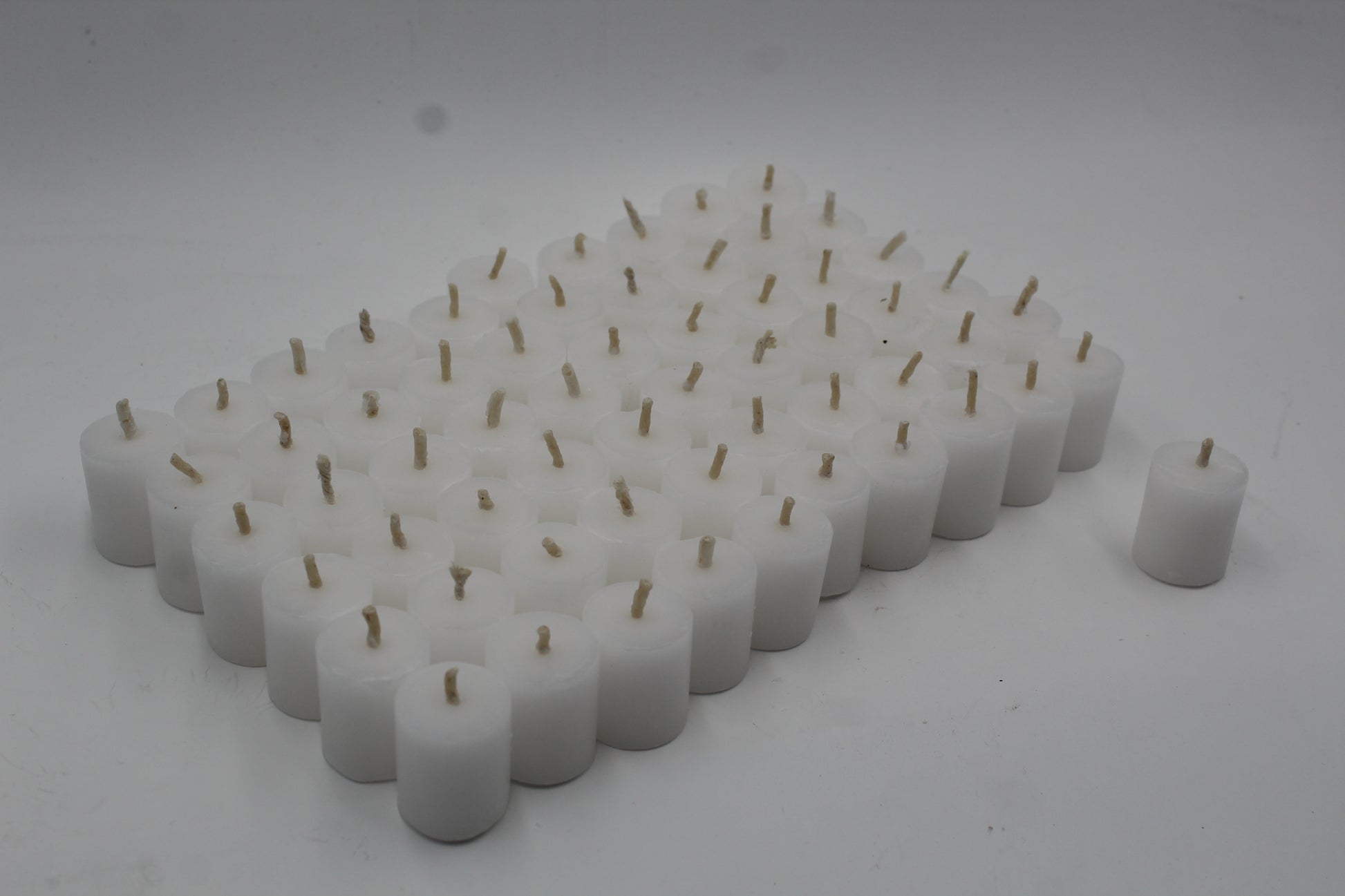 60 Velas de alta calidad en forma de cirio (3x3 cm), elaboradas con parafina y malasia para una combustión uniforme y prolongada (aprox. 2 horas de duración). Ideales para decoración, eventos, ceremonias o ambientación.