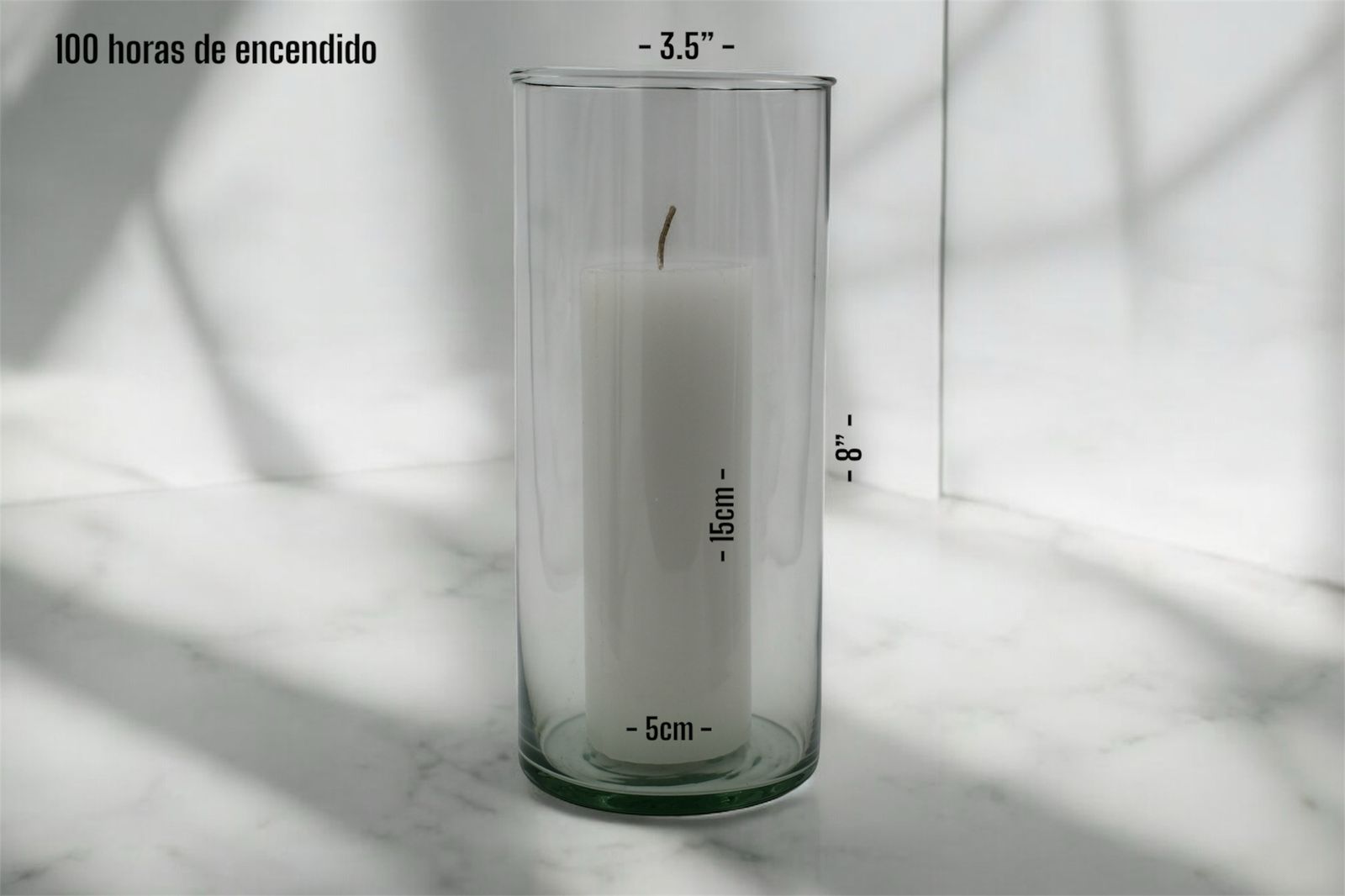 Descubre la elegancia vertical de nuestro cirio blanco de 15 cm de alto X 5cm de ancho, contenido en un cilindro de cristal transparente de 3.5 pulgadas de diámetro por 8 pulgadas de altura.