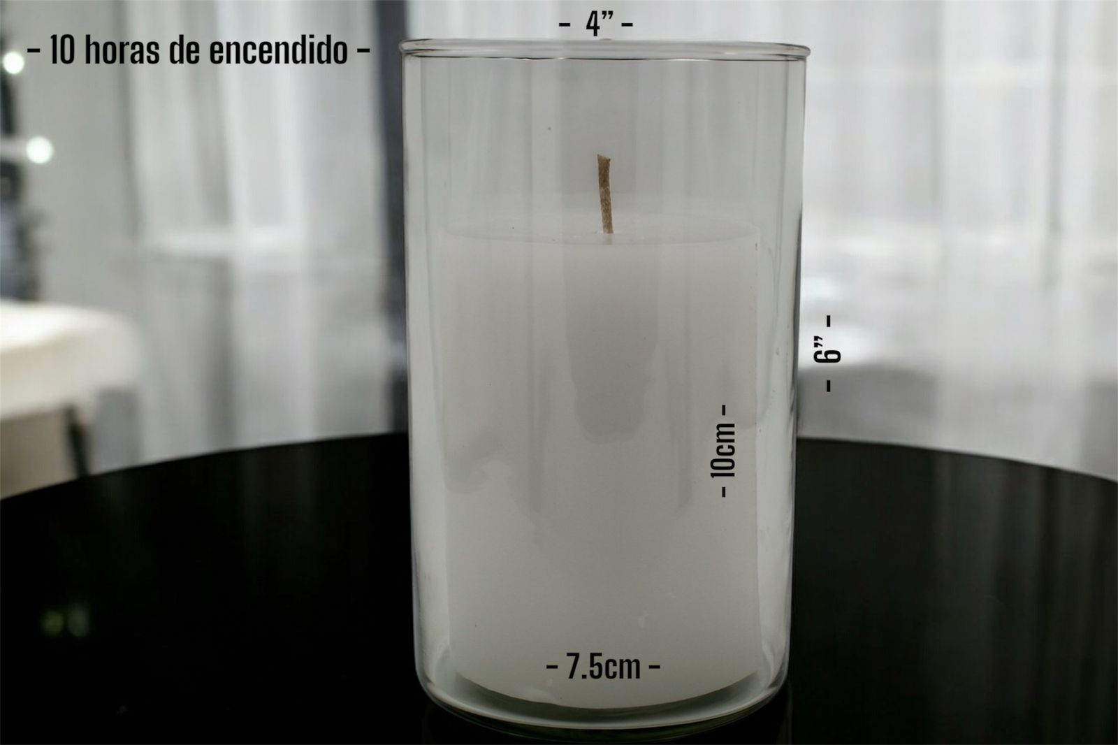 Eleva tu decoración con nuestra vela tipo cirio blanca, colocada dentro de un cilindro de cristal de 4 pulgadas de ancho x 6 pulgadas de alto, elaborado en vidrio grueso y resistente que garantiza seguridad, durabilidad y estilo.