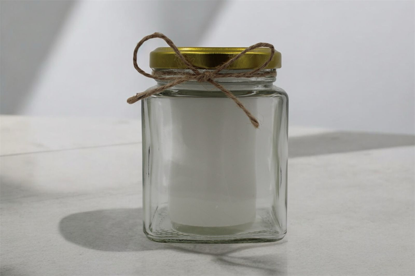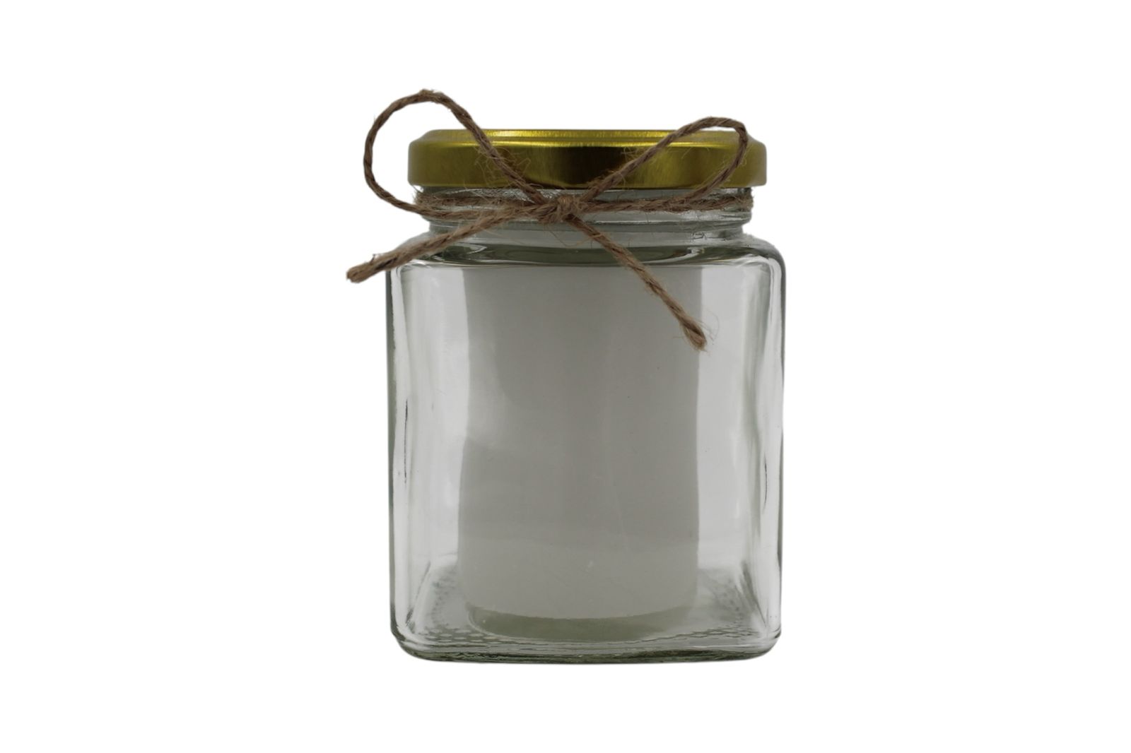 Esta vela en frasco de cristal cuadrado de 280ml con tapa dorada combina diseño y funcionalidad. Su vela interior es blanca, con dimensiones de 4.5 cm de ancho x 7 cm de alto, elaborada con una mezcla de parafina y cera de Malasia de la más alta calidad, asegurando una combustión uniforme y duradera.
