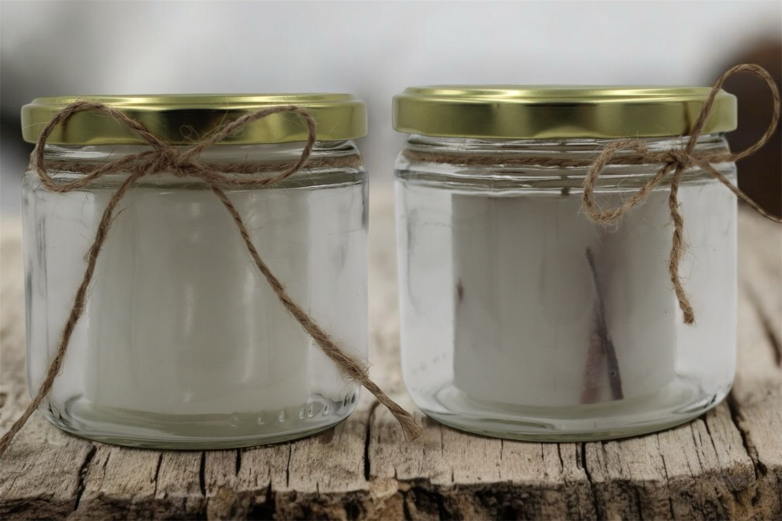 Velas de alta calidad en frasco cilíndrico de vidrio (9 cm de diámetro x 9 cm de alto) con tapa dorada. Disponibles en dos opciones: aromática con trozos de canela o sencilla en cera blanca. Elaboradas con una mezcla de parafina y cera de Malasia, garantizando una combustión uniforme y duradera.