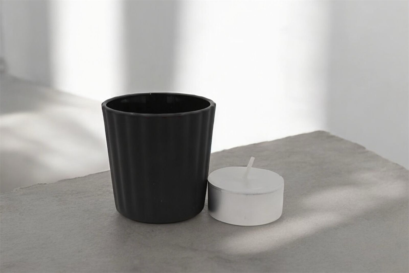 Vela Tea Light en Vaso Votivo de Cristal - Vaso Transparente o Negro Mate, 100% Blanca, con Base de Aluminio.