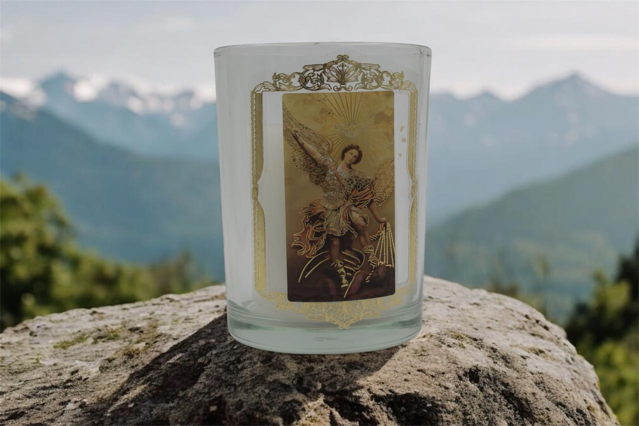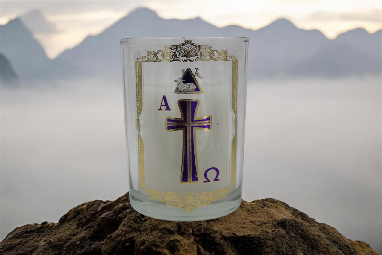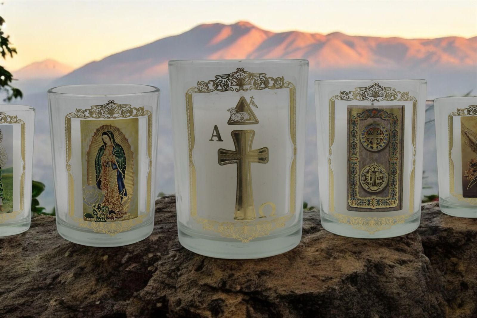 Producto de alta calidad con diseño inspirado en iconografía católica. Vaso de cristal con grabado en foil de acabado fino.